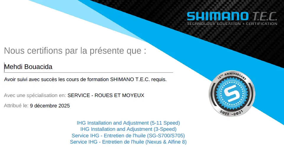 Formé et certifié Shimano TEC, je suis habilité à réaliser l’installation, la maintenance et l’entretien complet des moyeux à vitesses intégrées Shimano Nexus et Alfine, qu’ils soient en 3, 5, 7, 8 ou 11 vitesses.